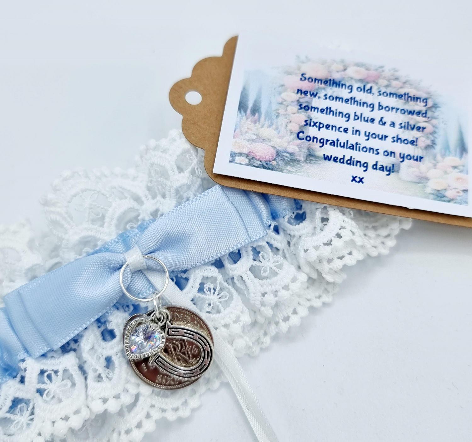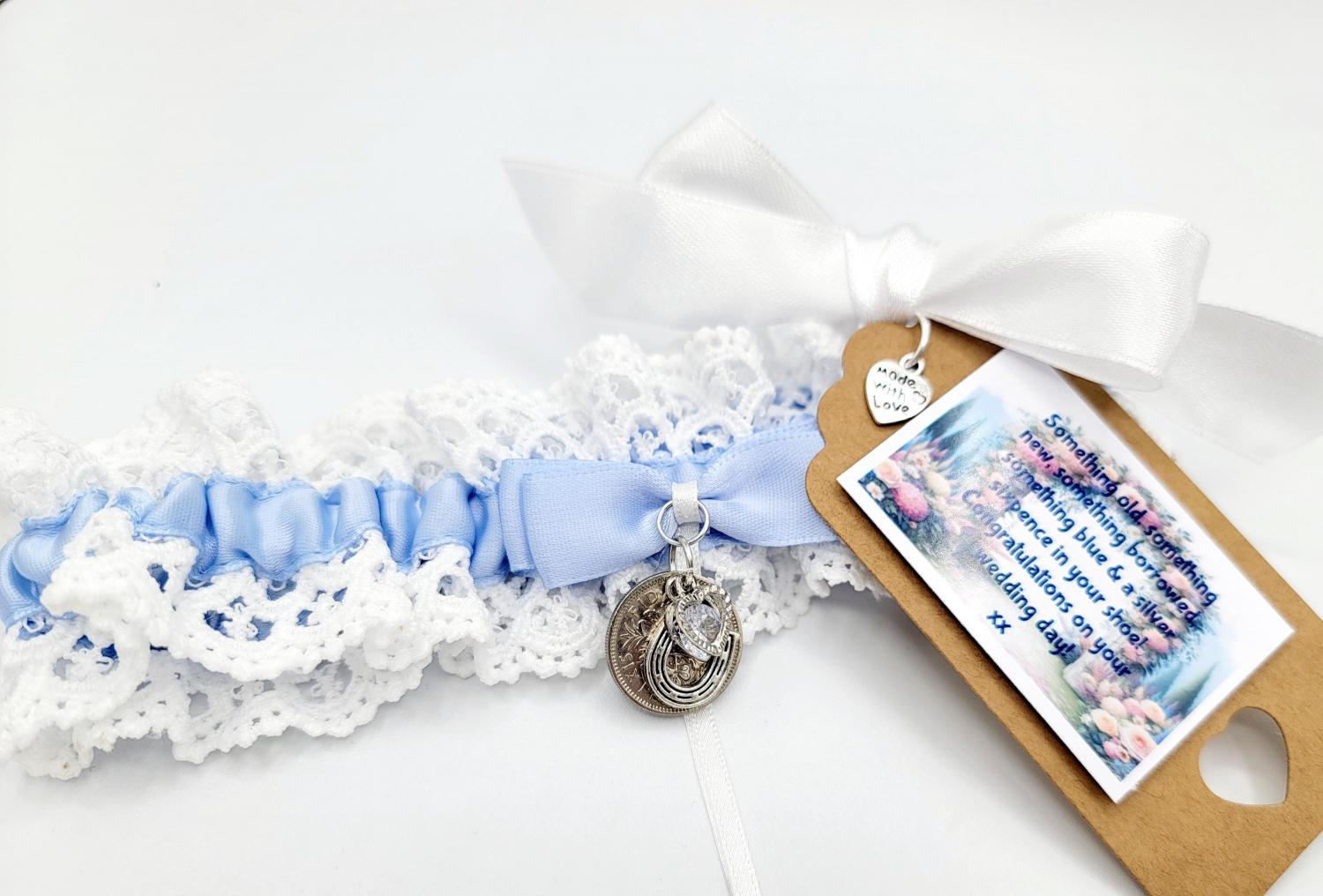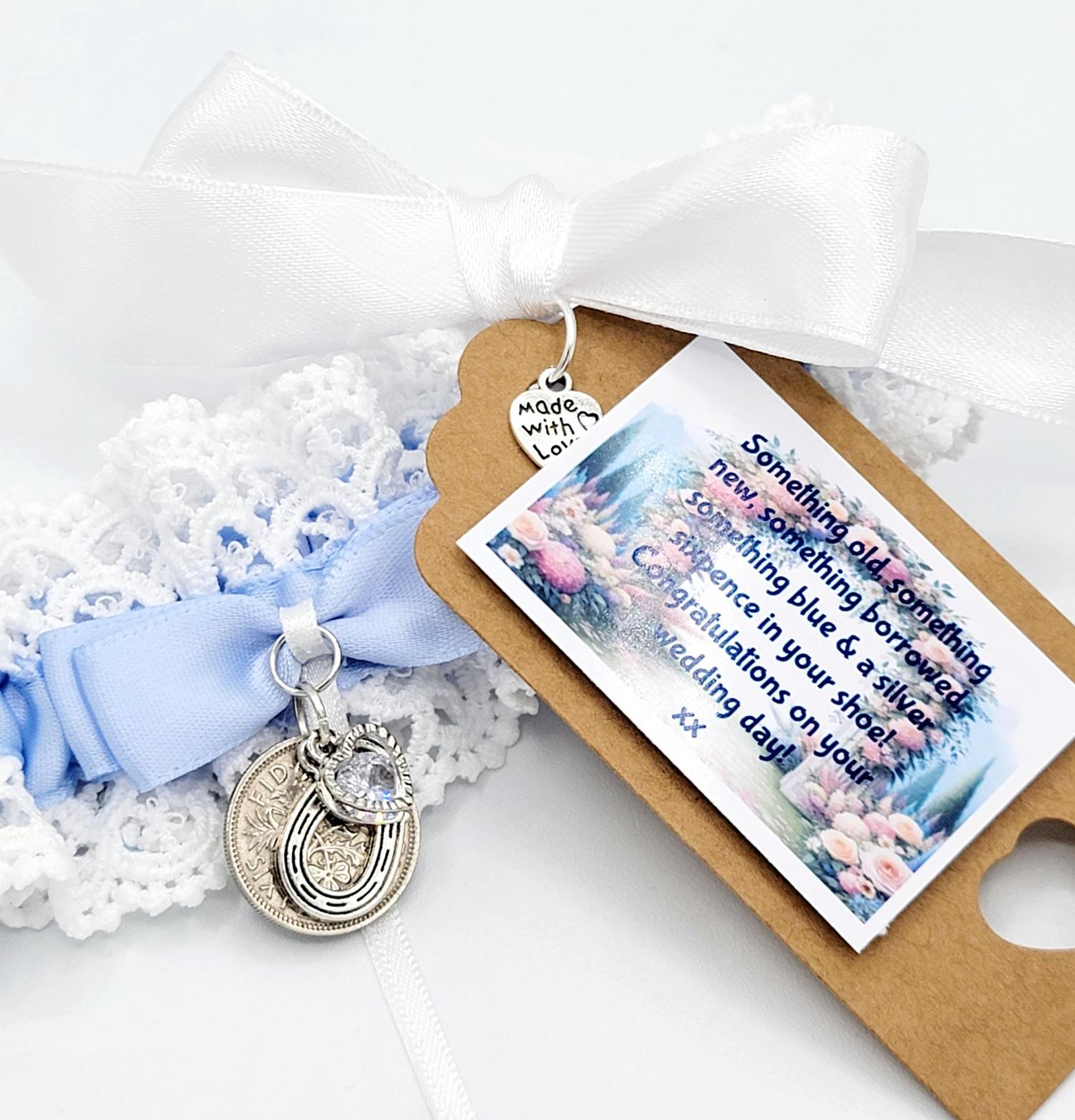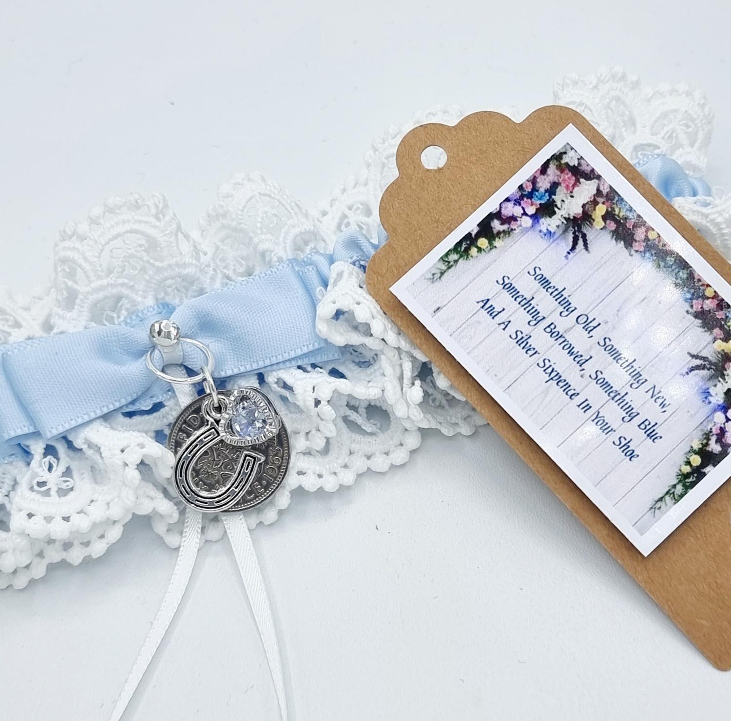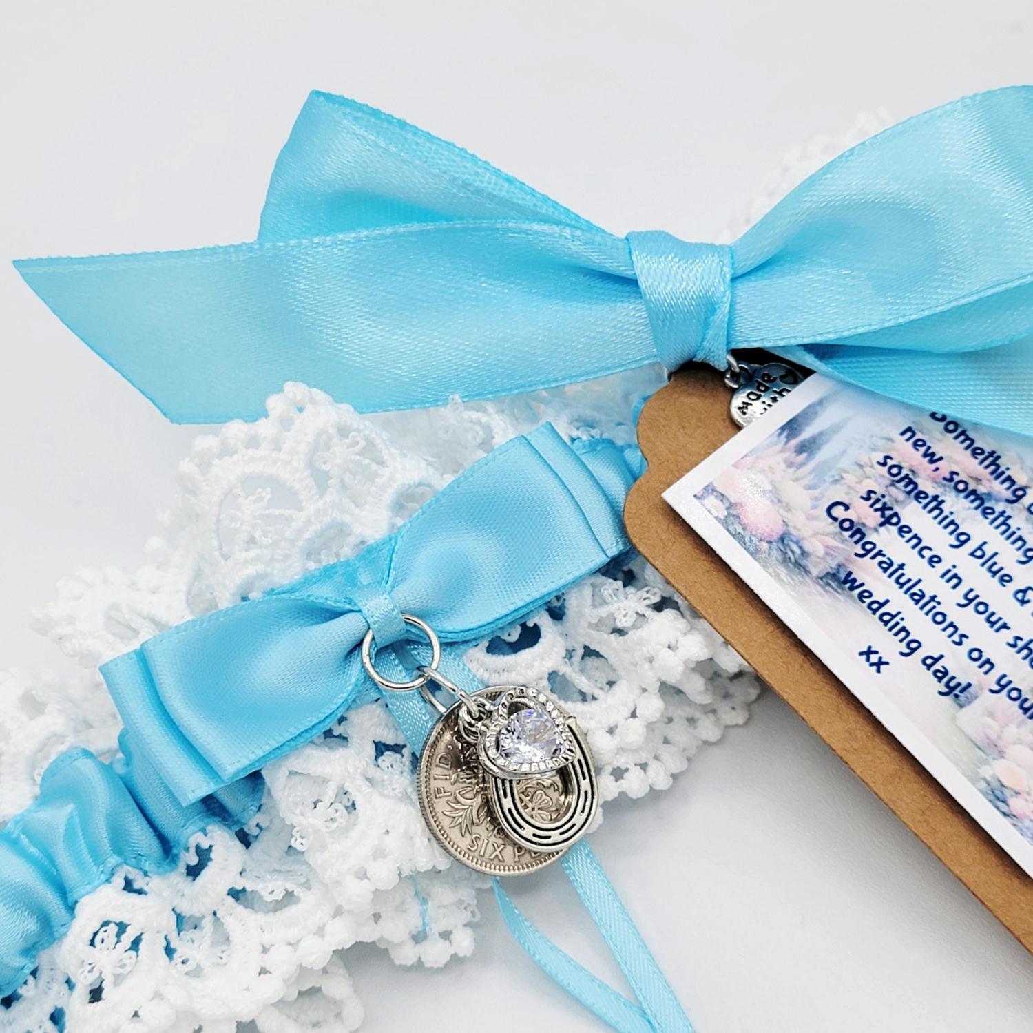 Garter Wedding Something Blue Sixpence Horseshoe Bride Gift Hen Party Free Gift Bag Tag