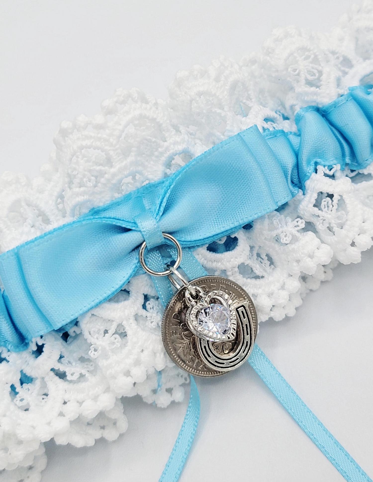 Something Blue Wedding Garter: Sixpence, Horseshoe, Bride Gift